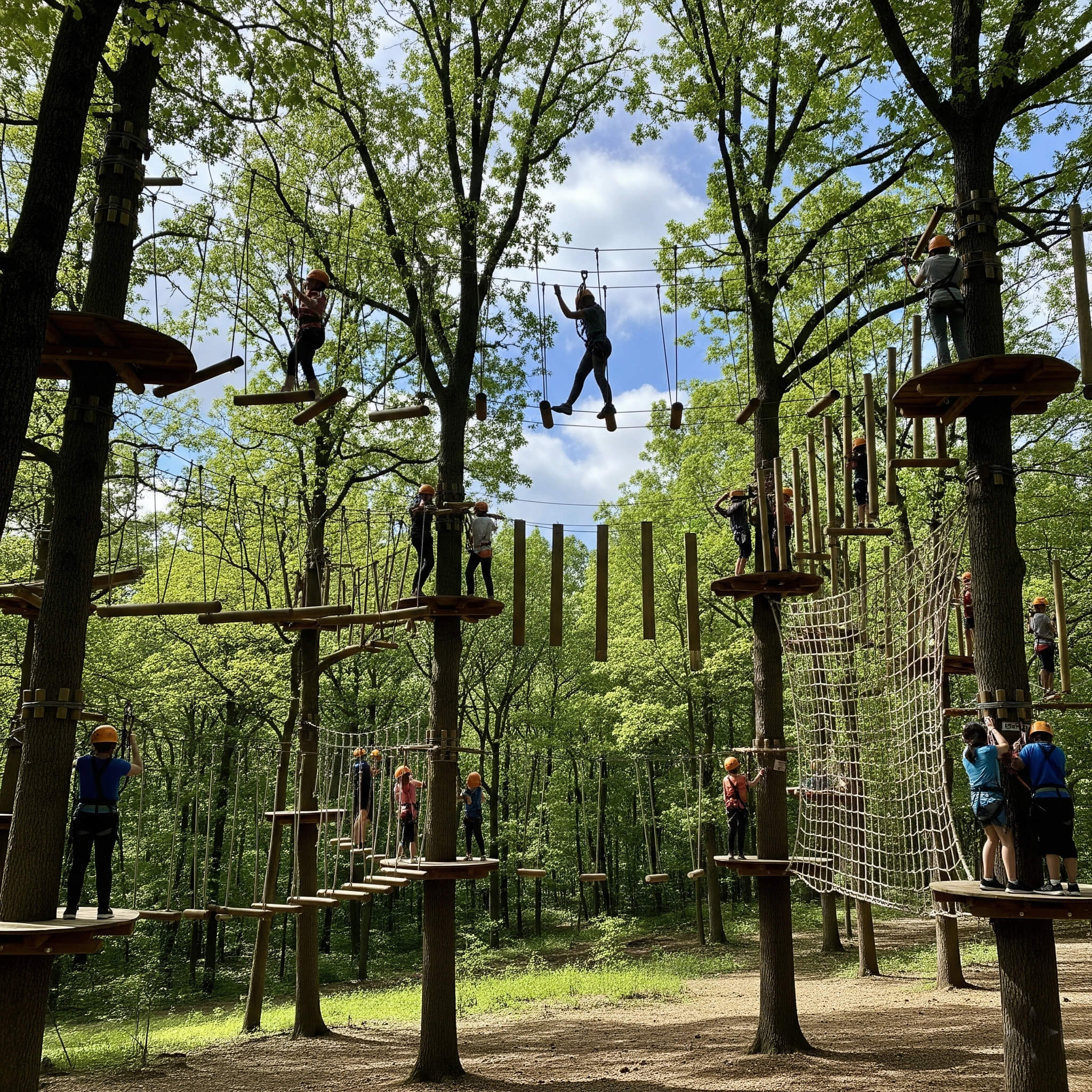 An outdoor aerial ropes course is a modern twist on the traditional obstacle course. Constructed using wood, cables, and ropes strung between trees or poles, these courses offer people of all ages the opportunity to learn about challenges, risks, and rewards in a safe, exciting, and stimulating environment. Participants can tackle their fears, push their limits, and work together to accomplish more than they thought possible.