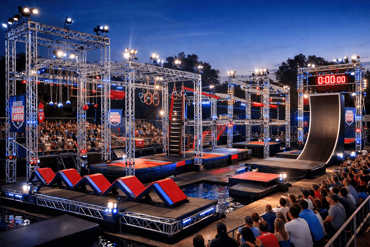 Conquer the iconic curved Warped Wall that tests your speed and upper body strength. Leap from rung to rung on the Salmon Ladder using only your upper body power. Scale between two vertical walls on the Spider Climb using your hands and feet in a thrilling vertical race. Navigate the angled Quad Step platforms that require precision and balance.