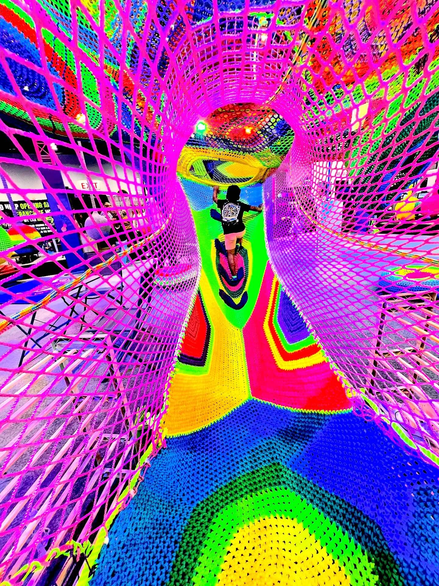 Our new concept of entertainment and amusement can be used for climbing, descent, jumping, hiding, swinging, spinning, rolling and crawling. Contains a single or multi-layer web with several suspension points to a fixed support. Hand-crochet in one or more colors. The individual parts of the net are located on different levels and are connected to each other, forming sections with different functions – a swing, a tunnel, a bed, a sleeve, etc., located horizontally, vertically or inclined respectively to the ground.