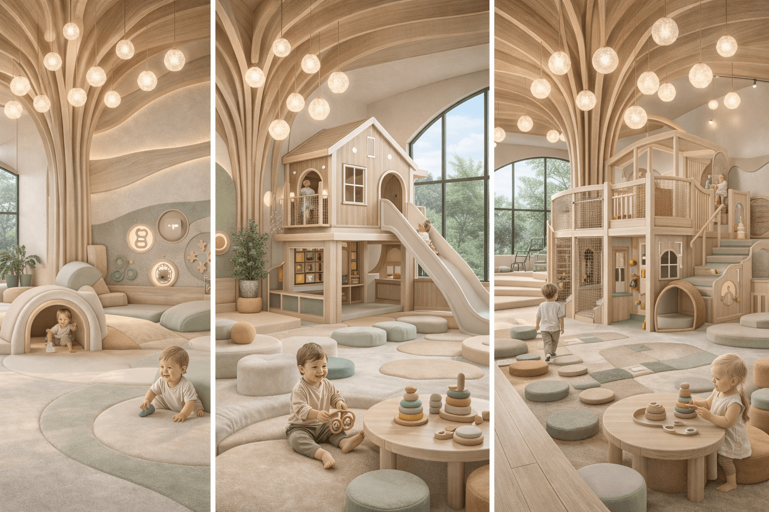 Each play room is thoughtfully designed to support children at different stages of early development. Natural materials, soft forms, and carefully scaled play elements create calm, engaging environments that encourage safe exploration, movement, and imagination.